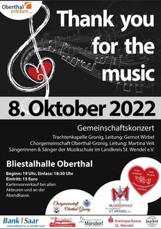 Nach der Weinwanderung am vergangenen Wochenende, steht die nächste Veranstaltung schon in den Startlöchern. Am Samstag, den 08. Oktober ab 19:00 Uhr, wird durch die Trachtenkapelle Gronig, die Chorgemeinschaft Oberthal-Gronig und Sängerinnen und Sänger der Musikschule im Landkreis St.Wendel e.V. ein Gemeinschaftskonzert veranstaltet. Unter dem Motto: „Thank you fort the music“ wird in die Bliestalhalle eingeladen. An alle Musik interessierte, es ist wie bei allen musikalischen Veranstaltungen dieser Vereine zuvor, man kann nur empfehlen teilzunehmen und sich von einem tollen Programm bezaubern zu lassen. Schaut vorbei und unterstützt die Vereine und ihr Engagement.