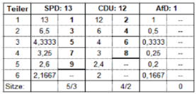 Die Verteilung der Sitze ist nachstehend berechnet und ergibt ein Verhältnis von 5:4 bzw. 3:2 im Rechnungsprüfungsausschuss.