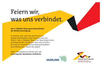 Vom 2. bis 4. Oktober 2025 wird das Saarland Gastgeber für ganz Deutschland, die Großregion und darüber hinaus: Unter dem Motto „Zukunft durch Wandel“ finden dann die Feierlichkeiten zum Tag der Deutschen Einheit in Saarbrücken statt. Erwartet werden mehrere Hunderttausend Besucherinnen und Besucher – und die dürfen sich auf ein buntes und erlebnisreiches Programm freuen. Ob Musik, Streetart, Akrobatik, Zauberei oder Lichtkunst: auf nahezu 20 Bühnen und Szeneflächen zeigen rund 600 Künstlerinnen und Künstler ihr Können. Hinzu kommen Dialog und Mitmachaktionen, Geschichte und Demokratie und nicht zuletzt Genuss und Kulinarik auf den zahlreichen Themenmeilen in der gesamten Saarbrücker Innenstadt. Ministerpräsidentin Anke Rehlinger lädt dazu ein, dabei zu sein: „Der Tag der Deutschen Einheit hier im Saarland ist eine wunderbare Chance, unser schönes Bundesland mit all seinen Facetten zu präsentieren. Ich freue mich auf alle Gäste von nah und fern. Erleben Sie vom 2. bis 4. Oktober ein saarländisches Deutschlandfest mit spannenden Begegnungen, interessanten Debatten und Dialogen und einem lebendigen Austausch. Seien Sie herzlich willkommen in unserer Landeshauptstadt und genießen Sie ein abwechslungsreiches Musik-, Kunst- und Kulturprogramm sowie zahlreiche kulinarische Köstlichkeiten. Feiern wir gemeinsam, was uns verbindet!“