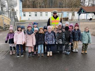 Die „Wackelzähne“ der KiTa Waldwichtel hatten Besuch vom Verkehrspolizisten. Herr Andler hat die Kinder im Hinblick auf die bevorstehende Einschulung im Sommer auf die Gefahren im Straßenverkehr aufmerksam gemacht und ihnen erklärt, auf was sie achten müssen, um sicher als Fußgänger im Straßenverkehr unterwegs zu sein.