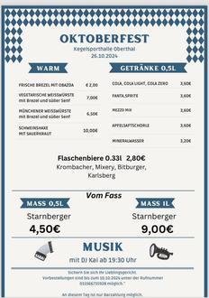 Am 26.10.2024 findet ab 19:30 Uhr in der Kegelhalle das Oktoberfest der neuen Pächter statt! Freuen Sie sich auf leckere typisch bayerische Speisen und Getränke. Um besser planen zu können, sind Vorbestellungen bis zum 10.10.2024 unter der Nummer 0155 66735928 gewünscht. Bitte beachten Sie, dass an diesem Tag nur Barzahlung möglich ist.