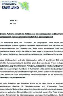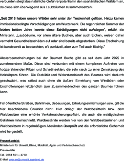 Mit dem Absterben von Altbäumen kommt es im Wald immer zu erhöhten waldtypischen Gefahren für Waldbesucherinnen und Walbesucher. Trotz langanhaltender Niederschläge während der Vegetationsperiode konnten die aus den Vorjahren verbuchten Dürreschäden nicht kompensiert werden. Die Folge ist das weitere Fortschreiten der Absterbeprozesse, vorwiegend bei Laubbäumen. Damit verbunden steigt das natürliche Gefahrenpotential in den saarländischen Wäldern an, da diese sich überwiegend aus Laubbäumen zusammensetzen.