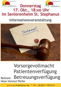 Am Donnerstag, 17. Oktober 2024, 18.00 Uhr, bietet der Förderverein St. Stephanus e.V. einen Vortrag zum Thema „Vorsorgevollmacht, Patientenverfügung und Betreuungsverfügung“ mit Herrn Notar Hartmut Pfeifer an.