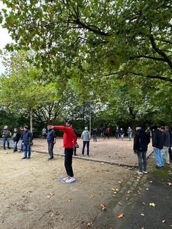 Weiter ging es in Gronig am DGH, denn dort fand in gewohnter Weise das „Eisenfresser“-Turnier des Petanqué Club 94 Oberthal statt. Hier fanden sich Teams aus dem ganzen Saarland, sowie unsere Freunde aus unserer Partnergemeinde „Moyenmoutier“ zusammen. Über den ganzen Tag wurden die Eisenkugeln auf das sogenannte „Cochonnet“ oder bei uns eher bekannt das „Schweinchen“ geworfen bzw. versucht so nah ran wie möglich zu kommen. Wenn man zuschaut bekommt man den Eindruck, ach dat kann eich aach, so schwer kann dat net senn. Aber bei noch genauerem Hinschauen wird einem aber doch schnell deutlich, so einfach ist es dann doch nicht. Auf jeden Fall hatten alle Teams ihre Freude daran, bei dem sehr gut organisierten Turnier sich mit Spaß zu duellieren. Zum Schluss spendeten noch unsere Freunde des eisernen Kugelsports 600€ zu gleichen Teilen an die Jugendfeuerwehr Oberthal-Gronig und dem Jugendzentrum Gronig.
