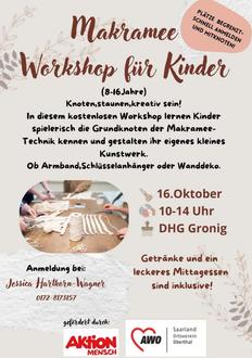 die AWO Oberthal lädt euch herzlich zu ihrem Workshop Makramee ein. Verbringt einen schönen Tag mit Freunden und auch neuen Bekanntschaften. Dank der Unterstützung von Aktion Mensch ist dieser Workshop für euch kostenlos. Also seid schnell und meldet euch an, denn die Teilnahmeplätze sind begrenzt. Infos entnehmt ihr bitte von unserem Plakat oder sprecht uns an.
