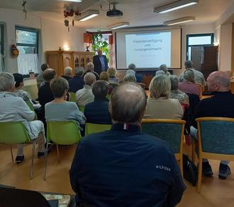 „Inzwischen haben die Informationsabende in unserem Hause schon Tradition“ sagte die Heimleiterin, Frau Sabine Wecker, zur Eröffnung der Veranstaltung „Patientenverfügung und Vorsorgevollmacht“ am Donnerstagabend, 17. Oktober 2024 im Seniorenheim St. Stephanus. Seit dem Frühjahr 2012 führt das Seniorenheim gemeinsame Informationsabende mit dem Förderverein St. Stephanus durch. Darin geht es immer um Themen mit Bezug zur Seniorenpflege, die aber auch für die breite Öffentlichkeit interessant sind. Der thematische Teil wird von Fachspezialisten getragen, die den Teilnehmerinnen und Teilnehmern auch in der anschließenden Diskussionsrunde Rede und Antwort stehen. Herr Notar Hartmut Pfeifer schilderte vor voll besetzten Stuhlreihen in seinem Vortrag grundlegendes Recht zum Thema „Patientenverfügung und Vorsorgevollmacht“. Wer mitten im Leben steht, beschäftigt sich oft nur ungern mit Fragen, die schwere Krankheit oder das Sterben betreffen. Und doch möchten viele Menschen selbst bestimmen: Welche Behandlungen wünsche ich mir am Lebensende; welche Therapien möchte ich auf keinen Fall, wenn ich nicht mehr für mich selbst entscheiden kann? Wer soll meine Wünsche durchsetzen, wenn ich selbst dazu nicht in der Lage bin? Die Patientenverfügung ist eine Möglichkeit, für entsprechende Situationen vorzusorgen. In der Vorsorgevollmacht kann ein Mensch selbstbestimmt festlegen, welche Vertrauensperson im Ernstfall einspringen soll, die zum Beispiel mit den Ärzten spricht oder sich um Konto und Wohnung kümmert.