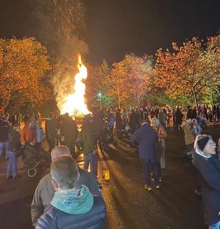 Im Anschluss ritt „unser“ St.Martin (Danke an Frau Lea Löchel) unter den Klängen des Musikvereins Gronig über die Bahntrasse zum Dorfgemeinschaftshaus (DGH). Begleitet wurde der Zug durch die Jugendfeuerwehr des Löschbezirkes (LBZ) Oberthal-Gronig. Am DGH angekommen wurde das Martinsfeuer entzündet und die Martinsbrezeln durch die Mitglieder der beiden Ortsräte verteilt. Der Musikverein sorgte wie in der Vergangenheit gewohnt für Speiß und Trank. Das alles reibungslos und mit größter Sicherheit ablief, verdanken wir den Feuerwehrkameradinnen und -kameraden des LBZ Oberthal-Gronig, vielen Dank.