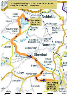Anlässlich eines angemeldeten Aufzuges nach dem Versammlungsgesetz in Form einer Lichterfahrt mit ca. 60 land- oder forstwirtschaftlichen Zugmaschinen besteht am Samstag den 30.11.24 im Zeitraum zwischen 17:30 Uhr und ca. 20:00 Uhr die im nachfolgenden Plan ersichtliche Verkehrsbeschränkung. Diese gilt jedoch nur so lange, wie die tatsächliche Inanspruchnahme der öffentlichen Verkehrsfläche durch den Aufzug erfolgt.