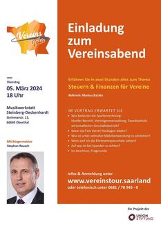 flichten bringt die Gemeinnützigkeit mit sich? Welche Fallstricke gibt es? Antworten auf diese und weitere Fragen rund um das Thema „Steuern und Finanzen für Vereine“ gibt die „Vereinstour Saarland“ der Union Stiftung am Dienstag, den 5. März 2024, um 18 Uhr in der Musikwerkstatt Steinberg-Deckenhardt.