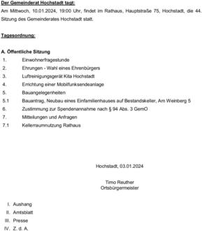 Am Mittwoch, 10.01.2024, 19:00 Uhr, findet im Rathaus, Hauptstraße 75, Hochstadt, die 44. Sitzung des Gemeinderates Hochstadt statt.