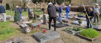 Wer hat zwei Stunden Zeit fürs Ehrenamt? 9 - in Worten "neun" Freiwillige nahmen sich Zeit, um unseren Friedhof im Oberdorf rechtzeitig zum Osterfest zu "verschönern". Alle Wege zwischen den Grabreihen wurden von Unkraut befreit. Nach zwei Stunden war die Arbeit erledigt.