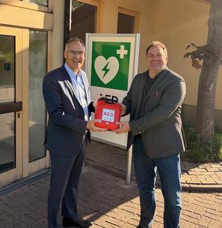 Landrat Dietmar Seefeldt bei der Übergabe des AED an den Ortsbürgermeister Martin Hammer