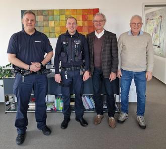 Bürgermeister Axel Wassyl und das Team des Fachbereichs Bürgerdienste begrüßen den neuen Kontaktbeamten der Polizei, Jannes Rogge, im Rathaus.