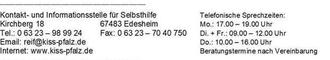 Die Kontakt- und Informationsstelle für Selbsthilfe (KISS Pfalz) informiert zu Treffen im Selbsthilfetreff, Kirchberg 18, Edesheim, Tel. Nr. 06323-989924, www.kiss-pfalz.de