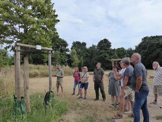 Sich aufmachen, gute Beispiele genau anschauen, von anderen lernen, lohnt meist. Die Teilnehmer*innen, die an der Exkursion der Gemeinde Essingen zum Arboretum Flemlingen teilnahmen, können dies bestätigen. So viel Neues, Interessantes und Wissenswertes gab es in der knapp 2 stündigen Führung von Bernhard Bäcker, der an diesem Zukunftsprojekt der Verbandsgemeinde Edenkoben maßgeblich beteiligt war, zu hören. Der Diplom-Ingenieur für Forstwirtschaft war in seinen Ausführungen kaum zu bremsen. Da ging es um die Entstehungsgeschichte: ein Ort der Nachhaltigkeit, der Begegnung und des Lernens sollte geschaffen werden. Und natürlich um viele Aspekte des Klima-, Umwelt- und Artenschutzes. Es war beeindruckend wie das Projekt von der Idee bis zur Umsetzung von den Beteiligten vorangetrieben wurde. Und mit welcher Leidenschaft und festen Überzeugung weiterhin an einer Erweiterung des Projektes samt Renaturierung des Kaltenbachs gearbeitet wird. Ob es um die Modellierung des Geländes ging, um die Wegführung oder die Auswahl der klimaresistenten Bäume - viel gab es und gibt es zu tun. In Kürze werden alle Zukunfts-Bäume auch mit Namen beschriftet sein. Anhand der QR-Codes lassen sich dann fortführende Erläuterungen abrufen. So können sich Interessierte selbst viel Wissen beibringen. Wer das Arboretum lieber bei einer Führung erleben möchte, kann eine(n) Gästeführer*in über das Tourismusbüro Edenkoben buchen. Ein Besuch des Geländes sei aber auch allen empfohlen, die sich bei einem Zwischenstopp z.B. bei einer Radtour nur an der südpfälzischen Landschaft erfreuen möchten. Die Ausblicke von der Sitzgruppe am großen Sandsteintisch sind einfach herrlich. Also los geht´s zum Arboretum nach Flemlingen….