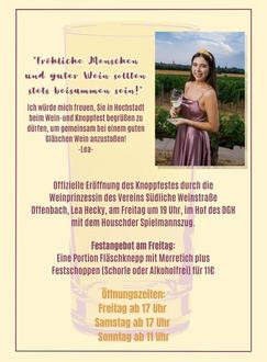 Die Eröffnung findet am Freitag, 11. August 2022 um 19 Uhr auf der Bühne auf dem Platz vor dem Dorfgemeinschaftshaus statt und wir freuen uns diese mit unserer frisch gekrönten Weinprinzessin des Vereins Südliche Weinstraße Offenbach, Lea Hecky, tun zu dürfen.