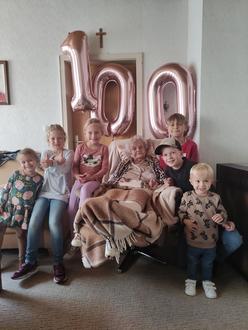 Auf dem Bild ist Frau Stern mit einem Teil ihrer 13 Urenkel.