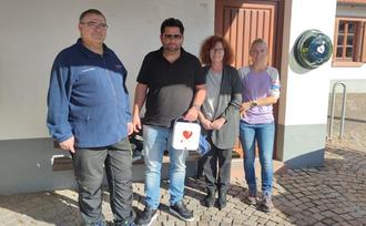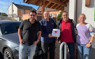 Unser Mitbürger Andreas Föllinger erläutert die Handhabung des Defi´s und gibt Ratschläge und Informationen zu den Geräten. Frau Jessica Lehmann, Beigeordneter Alexander Kirchmer und Dennis Baumann, der der Gemeinde den Defibrillator gespendet hat, sind froh, dass nun an den exponierten Stellen im Ort eine weitere Möglichkeit für schnelle Rettungsmaßnahmen besteht.