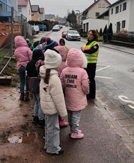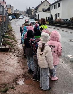 Nach der theoretischen Einführung ging es hinaus in den realen Straßenverkehr. Vor Ort übten die Kinder, wie sie sich verhalten sollen, wenn beispielsweise ein Auto den Gehweg blockiert oder die Sicht auf die Fahrbahn eingeschränkt ist. Dabei konnten sie das Gelernte direkt anwenden und wertvolle Erfahrungen sammeln.