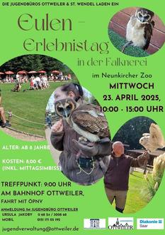 Die Jugendbüros Ottweiler und St. Wendel laden Kinder ab 8 Jahren am Mittwoch, dem 23.04.2025, zu einem Eulen-Erlebnistag ein. Wir starten mit der Flugshow, in die ihr aktiv mit eingebunden werdet. Danach erfahrt ihr viel Wissenswertes rund um das Thema „Eulen“ und habt die Gelegenheit, all eure Fragen an die Falknerin zu stellen.