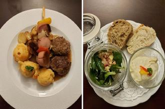 (Vegetariern wird eine entsprechende Alternative mit einem vegetarischen Bratling und einem Gemüsespieß angeboten)