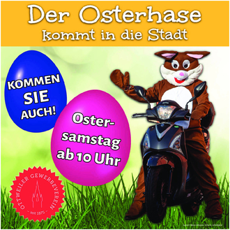 Für Karsamstag, den 30. März 2024, wird der Osterhase in der Ottweiler Altstadt erwartet, von 10:00 Uhr bis 12:00 Uhr. Dann hat er alle Hände voll zu tun, um vor allem den Kindern bunte Eier und Schokohasen zu schenken. Der Steinbacher Bürger Thomas Lafontaine schlüpft wieder in die Rolle des Osterhasen, zieht dafür zuvor ein braun-weißes Hasenkostüm an und stellt so traditionelles Osterbrauchtum dar. Ermöglicht wird die Aktion durch eine bewährte Kooperation des Gewerbevereins mit dem Stadtmarketing.