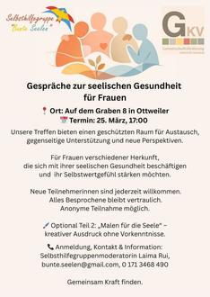 Die Veranstaltung "Gespräche zur seelischen Gesundheit für Frauen" am 24. März wird auf 25. März verschoben. Alles andere bleibt unverändert.