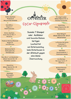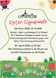 Ottweiler Oster-Olympiade am 28. März 2026: Am Samstag, 28. März 2026, lädt der Ottweiler Gewerbeverein zur großen „Ottweiler Oster-Olympiade“ ein. Die Aktion richtet sich speziell an Kinder und findet von 10:00 bis 14:00 Uhr in den teilnehmenden Geschäften und Lokalen der Innenstadt statt. An verschiedenen Stationen können die jungen Teilnehmerinnen und Teilnehmer basteln, malen, spielen und kleine Aufgaben lösen. Ob kreative Osterdekoration, lustige Spiele oder knifflige Rätsel - für Abwechslung und Spaß ist bestens gesorgt.