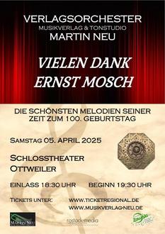 Erleben Sie einen unvergesslichen Abend voller musikalischer Höhepunkte während eines Galakonzerts. Dies steht unter dem Motto "Vielen Dank Ernst Mosch". Zu Ehren des 100. Geburtstags des Begründers der böhmischen Blasmusik lädt das Verlagsorchester Martin Neu mit dem Gesangduo Rita und Martin zu einer Zeitreise durch das beeindruckende Lebenswerk von Ernst Mosch ein. Lassen Sie sich von unvergesslichen Erfolgsstücken wie "Fuchsgraben", "Rauschende Birken", "Mondschein an der Eger" und "Musikantenstolz" verzaubern. Auch Klassiker wie “Starparade” und “Jeder sucht in seinem Leben” werden erklingen und die Herzen der Blasmusikliebhaber höherschlagen lassen. Dieses Konzert ist ein Muss für jeden Fan von Ernst Mosch und der böhmischen Blasmusik. Moderation Harry Raith, Schloßtheater Ottweiler, 05.04.2025, Karten unter ticketregional.de; VVK Stellen: Rathausbäckerei, Modehaus Neufang-Rennwald, Presseshop Vitello, alle Ottweiler, Klosterbäckerei Ottweiler u. Hangard, Susis Backstübchen in Niederkirchen, JederKannWein in Niederkirchen; Einlass: 18:30 Uhr.