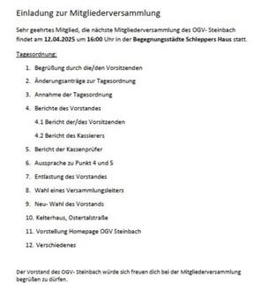 Am 12.04.2025 findet die diesjährige Mitgliederversammlung des Obst- und Gartenbauverein Steinbach statt. Die Versammlung beginnt um 16:00 in der AWO-Begegnungsstätte "Schleppersch-Haus". Hierzu sind alle Mitglieder herzlich eingeladen.