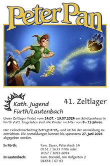wir freuen uns, dass auch in diesen Sommerferien wieder unser Zeltlager stattfindet. Dazu möchten wir euch vom 14. bis 19.07.24 ganz herzlich einladen, viel Spiel und Spaß rund um das Thema „Peter Pan“ am Schützenhaus in Fürth zu erleben.