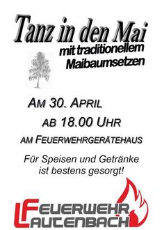 Auch in diesem Jahr veranstaltet die Freiwillige Feuerwehr wieder den „Tanz in den Mai“ mit traditionellem Maibaumsetzen. Beginn ist wie immer am 30. April um 18:00 Uhr am Feuerwehrgerätehaus. Für Speisen und Getränke ist bestens gesorgt; die Lautenbacher Bevölkerung ist wie immer recht herzlich eingeladen.