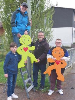 Der ehemalige Ortsvorsteher Udo Zägel und der jetzige Ortsvorsteher Achim Wagmann befestigten gemeinsam einen grünen StreetBuddy in der Stegbachstraße. Stellvertretend für alle Mainzweiler Kinder halfen Elias Wagmann und Tim Kilian kräftig mit.