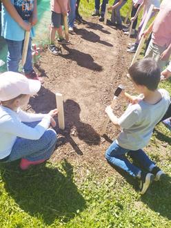 Die Vorbereitungen übernahm der Obst- und Gartenbauverein Ziegelhütte, der am Wochenende zuvor Sand und frischen Mutterboden auf die Fläche aufbrachte. So konnte jede Klasse ihr eigenes Beet gestalten. Unter der Anleitung von Herrn Nehren säten die Kinder Blütensamen aus, drückten sie mit Klopfbrettern an, setzten Holzpflöcke und spannten ein Schutznetz darüber.