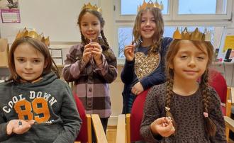 Das Feiern des Dreikönigsfestes nach französischer Tradition gehört mittlerweile bereits seit einem Jahrzehnt zum schulischen Alltag an der Grundschule Lehbesch. Dabei wurde zum Dreikönigstag 2023 in der ersten Schulwoche ein warmes Kuchenstück aus Blätterteig und einer Mandelmasse an die Kinder in Klassenstufe 3 und 4 verteilt. König oder Königin des Tages durften sich schließlich diejenigen Kinder nennen, die die ,,fève“, eine kleine Porzellanfigur in ihrem Kuchenstück entdeckten. Krone und ,,fève“ gingen damit in ihren Besitz über. Die gekrönten Kinder, insgesamt waren es zehn Schülerinnen und Schüler, durften bestimmen, welche Spiele, Musikstücke oder Vorlesegeschichten im Französischunterricht an diesem Tag an die Reihe kamen. Wir danken dem Vorstand des Fördervereins für die Kostenübernahme der traditionellen französischen Kuchen.