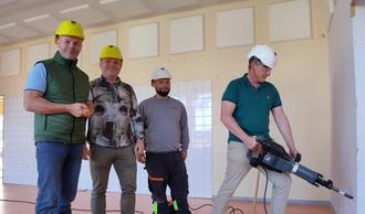Der Bürgermeister ließ es sich nicht nehmen, symbolisch zum Pickhammer zu greifen – ein Zeichen für den Startschuss in eine spannende Bauphase. Das Projekt soll die Lernbedingungen verbessern und das Ganztagsangebot an der Grundschule Neumünster nachhaltig stärken.