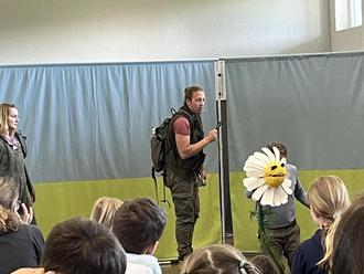 In dem einstündigen Theaterstück ermittelten die „Umweltdetektive“, gespielt von Elena Fellich und Robin Münch, in einem spannenden Fall rund um Schadstoffbelastete Pflanzen und das geheimnisvolle verschwinden des Nektars. Auf kindgerechte und spielerische Weise klärten sie dabei auf, warum Pestizide schädlich für die Natur sind und was Bienen und Pflanzen wirklich zum Leben brauchen. Dabei gab es auch einen wertvollen Tipp, was jeder einzelne Zuhause tun kann: Nektarreiche Pflanzen für Bienen- und Insektenwelt im Garten pflanzen. Unterstützt wurden die Hauptfiguren von fantasievollen Nebenrollen wie dem kranken Baum Adam, der Biene Winnie und der von Schadstoff belasteten Kamillepflanze - allesamt lebendig und eindrucksvoll dargestellt durch Holger Giebel. Das Theaterstück wurde vom Theater TFF aus Köln ausgeführt, das sich durch seine kreativen und zugleich pädagogisch fundierten Produktionen auszeichnet. Mit viel Einfühlungsvermögen und Humor gelang es den Schauspielerinnen und Schauspielern, die Kinder nicht nur zu unterhalten, sondern sie auch zum Nachdenken anzuregen - ein unterhaltsames Erlebnis mit nachhaltiger Wirkung.