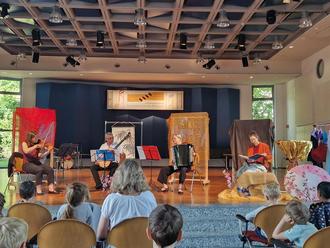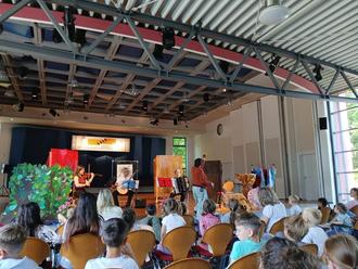 Am Dienstag, den 20. Mai, wanderten wir, die Erstklässler der Grundschule Neumünster mit unseren Lehrerinnen, zur Landesakademie für musisch-kulturelle Bildung. Unser Musikpädagoge Peter Knerner hatte uns zum Kinderkonzert „Die chinesische Nachtigall“ eingeladen und wirkte auch selbst mit. Eine Erzählerin nahm uns mit auf die Reise nach China, in die Gärten des Kaisers. Sie erzählte das Märchen „Der chinesischen Nachtigall“, die eingefangen wurde, um für den Kaiser zu singen. Aber der Singvogel konnte in Gefangenschaft nicht singen und so bekam der Kaiser eine aufziehbare Nachtigall. Diese ging aber kaputt und der Kaiser wurde krank. Erst als die Nachtigall wieder in Freiheit singen konnte, wurde auch der Kaiser wieder gesund. Das einfühlsame Märchen wurde von einem Ensemble aus Gitarre, Violine und Akkordeon begleitet.