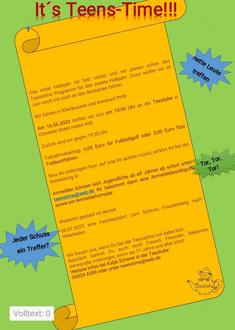 Teilnehmen können alle ab 11 Jahren, Anmeldung unter teenstime@web.de ist erforderlich.