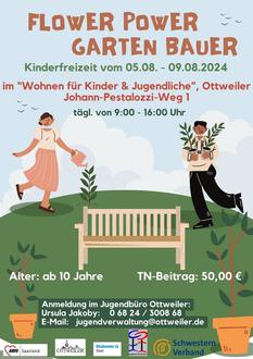 Der Schwesternverband, das AWO-Quartiersbüro und das Jugendbüro Ottweiler laden euch zur „Flower-Power – Gartenbauer“-Sommerfreizeit ein. In der Woche vom Mo., 05. – Fr., 09. August 2024 verbringen wir im „Wohnen für Kinder & Jugendliche“ und zusammen mit den jungen BewohnerInnen dort eine aktive Zeit. Wir möchten gemeinsam unter Anleitung eine Sitzbank bauen, die dann an der dortigen Bushaltestelle die Wartezeit erleichtern soll. Neben der Sitzbank wird dort mit euch auch ein Hochbeet gezimmert und mit Kräutern bepflanzt, die von jedermann und jederfrau genascht werden dürfen. Außerdem pflanzen wir zusammen schattenspendende Bäume!