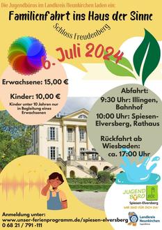 Die Jugendbüros des Landkreises Neunkirchen laden am 06. Juli 2024 Kinder und ihre Familie zu einer Fahrt ins Haus der Sinne im Schloss Freudenberg nach Wiesbaden ein.