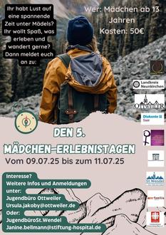 Im 5. Jahr werden die Mädchen-Wandertage zu den Mädchen-Erlebnistagen. Die Jugendbüros St. Wendel und Ottweiler gehen gemeinsam mit den Suchtberatungsstellen Knackpunkt aus St. Wendel und die Brigg Neunkirchen vom 9.07.- 11.07. 2025 mit Mädchen ab 13 Jahren wieder auf Tour – mit Rucksack und allerlei Themen, die euch interessieren, im Gepäck.