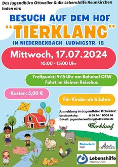 Am Mittwoch, dem 17.07.2024 besuchen wir den Hof „Tierklang“ in Niederbexbach. Ein ungewöhnlicher Name für einen ganz außergewöhnlichen Hof. Ihr erlebt dort viele einheimische Tiere in hautnahem Kontakt, könnt sie streicheln, bürsten und füttern.