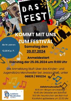 Kommt mit uns und dem Landkreis Neunkirchen, am 20.07.2024 mit nach Karlsruhe und gemeinsam besuchen wir „Das Fest“, eines der größten und beliebtesten Festival Deutschlands.
