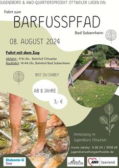 Am Dienstag, 06. August 2024, laden das Jugendbüro und das AWO-Quartiersprojekt Ottweiler Kinder ab 8 Jahren zu einem Ausflug zum Barfußpfad nach Bad Sobernheim ein. Wir fahren mit dem Zug ab Ottweiler und kommen in unmittelbarer Nähe des Barfußpfades in Bad Sobernheim an. Dort begeben wir uns dann auf einen ca. 3,5 km langen Rundweg. Wir erleben die herrliche Natur mit allen Sinnen beim Durchqueren des Lehmbades und des kleinen Flusses und haben sicher jede Menge Spaß dabei.