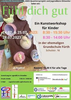 „Fühl dich gut“ – dieser ganz besondere Ferienworkshop geht in die nächste Runde. Die Lebenshilfe Neunkirchen, das AWO Quartiersprojekt in Ottweiler, der Jugendförderverein und das Jugendbüro Ottweiler laden Kinder ab 8 Jahren zum Start in die Sommerferien am 24. & 25. Juli, sowie am 28. Juli wieder ein, kreativ zu werden.