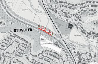 Eine Querung der B 41 für Fußgängerinnen und Fußgänger aus Richtung „Krumme Kehr“ in Richtung Wehranlage ist während der gesamten Bauzeit nicht möglich.