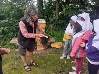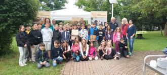 Am letzten Dienstag ging das Bienenprojekt des Obst- und Gartenbauvereins und des Bienenzuchtvereins in zwei dritten Klassen in die nächste Runde. Wir spazierten zum AWO Seniorenheim, denn dort warteten bereits drei Mitmachstationen auf uns. Nachdem wir gefrühstückt hatten, begrüßte uns Herr Nehren und erklärte uns die Stationen. Wir lernten an diesem Vormittag viel über die Bienen, wir schauten geschützt durch Imkeranzüge in die Bienenstöcke, versuchten Bienen mit der Becherlupe einzufangen und konnten sie so besser beobachten. An einer weiteren Station betätigten wir uns kreativ, wir stellen Buttons mit Bienenmotiven her und bastelten. Das Highlight des Vormittags war jedoch das Honigschleudern. Jedes Kind durfte an der Honigschleuder helfen und natürlich auch von dem leckeren Honig probieren. Gestärkt durch leckere Kaffeestückchen der AWO liefen wir wieder zurück zur Schule.