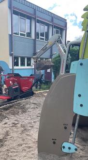 Ein großes Dankeschön geht besonders an die Firma Schneider Hubarbeitsbühnen und Baumaschinen GmbH, die uns nicht nur den Minibagger, sondern auch weitere technische Geräte zur Verfügung gestellt hat, um den Sandkasten im Kinderhaus Clara Fey zu entleeren.