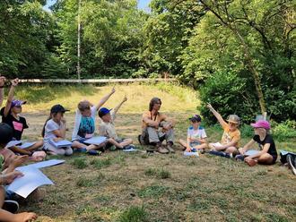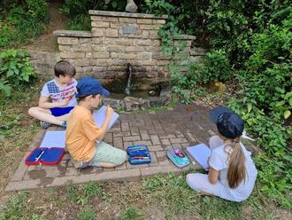 „Waldzeittag“ mit dem Wildnispädagogen Mike Adams. Heute wanderten wir bei strahlendem Sonnenschein zum Kerbacher Loch. Dort angekommen frühstückten wir, erfrischten uns am Brunnen und erkundeten die Umgebung. Danach spielten wir „Motte und Fledermaus“ und „Geräusche sammeln“. Dabei mussten alle Kinder leise sein, sonst konnte man ja nichts hören. Nun suchte sich jeder ein ruhiges Plätzchen im Schatten auf der Wiese und fertigte eine Geräusch-Landkarte an. Zum Abschluss spielten wir noch das Versteck- und Suchspiel „Adlerhorst“ im Wald. Nun machten wir uns wieder auf den Rückweg zur Schule. Uns allen hat auch diese Einheit des Projekts sehr viel Spaß gemacht. Vielen herzlichen Dank an Herrn Adams.